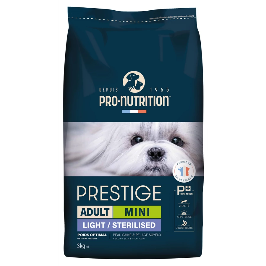 A Prestige MINI LIGHT/STERILISED táp segít fenntartani az optimális testsúlyt anélkül, hogy csökkentené a szokásos napi adag mennyiségét: 20%-kal kevesebb energiát tartalmaz, mint Prestige Adult Mini társa.
